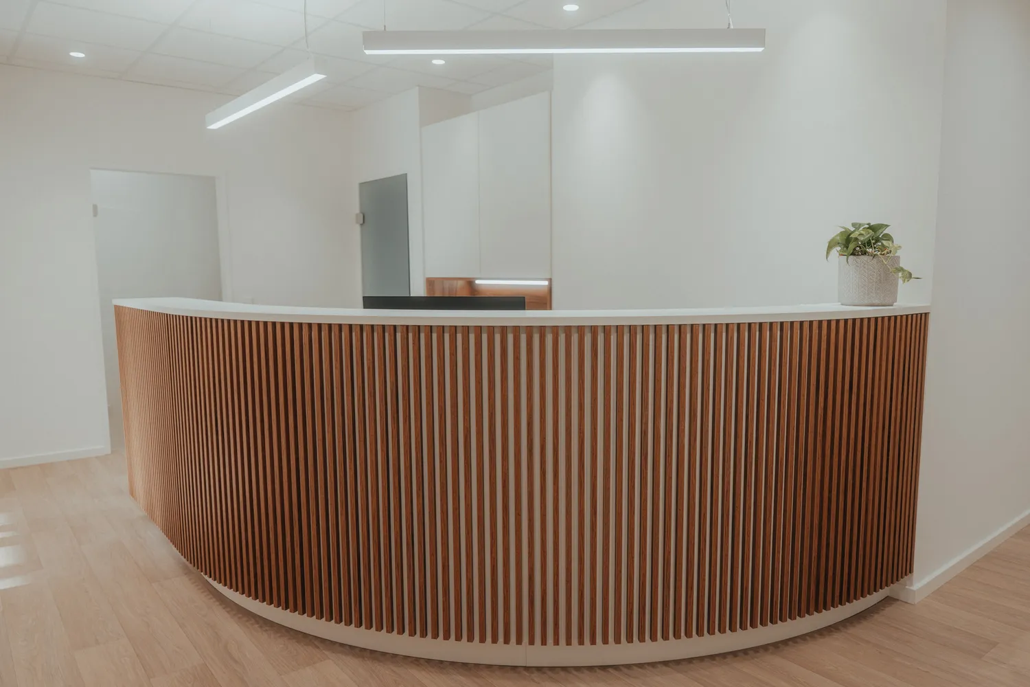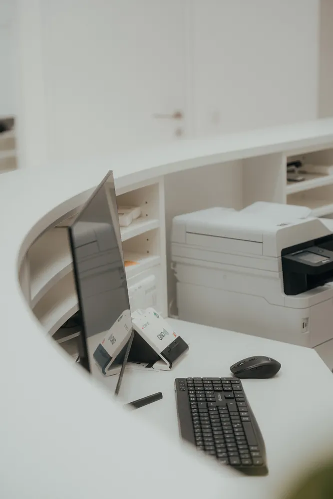 Einladender Empfangsbereich mit zwei Arbeitsplätzen, Drucker und e-card-Lesegerät.
